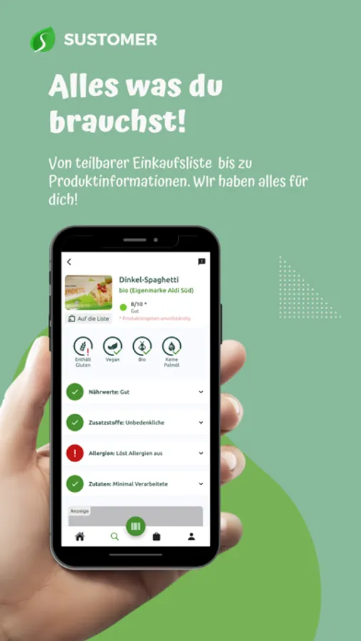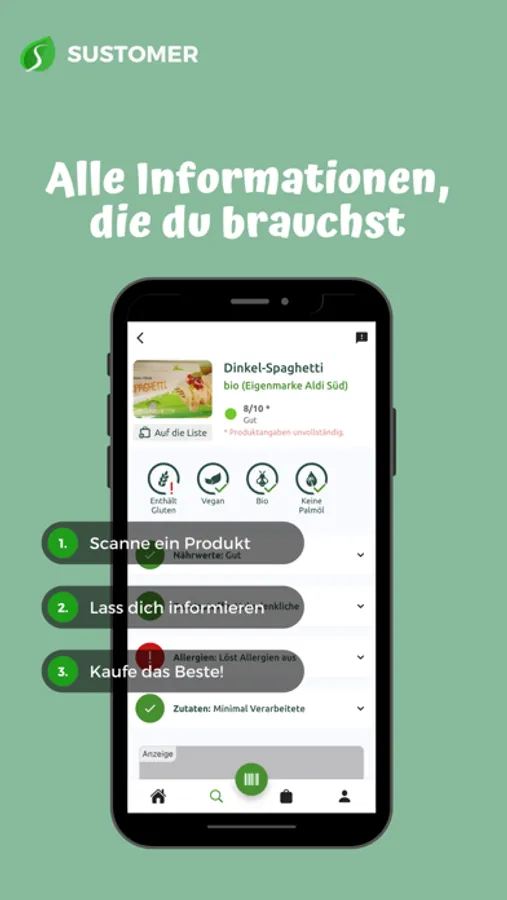 Sustomer ist dein persönlicher Einkaufsassistent rund um das gesunde und nachhaltige Einkaufen! Über das Scannen des Barcode von Lebensmitteln mit der App und durch die Suche nach Produktnamen findest du alle wichtigen Informationen auf einen Blick. Was steckt hinter den Inhaltsstoffen? Wie nachhaltig ist das Produkt? Ist das Produkt vegan, glutenfrei, laktosefrei? Enthält das Produkt Palmöl?