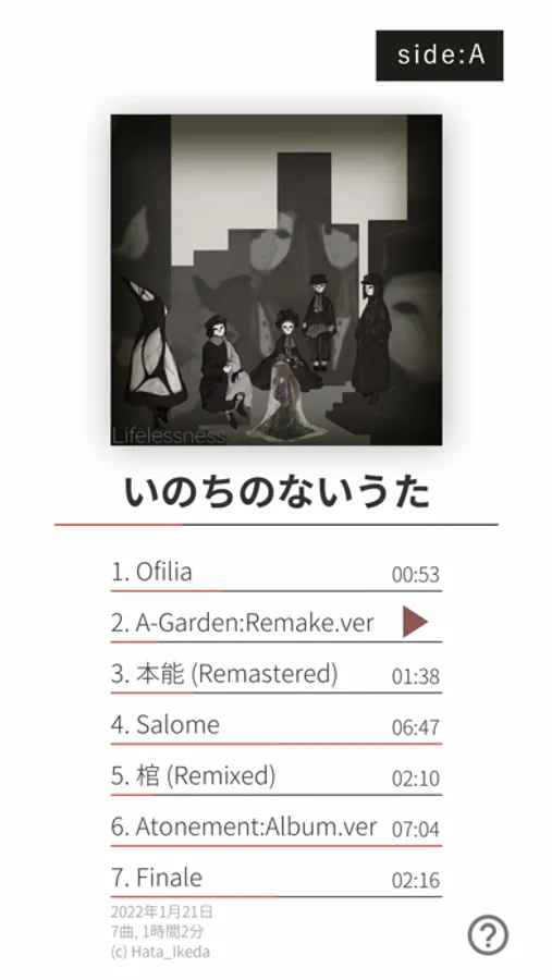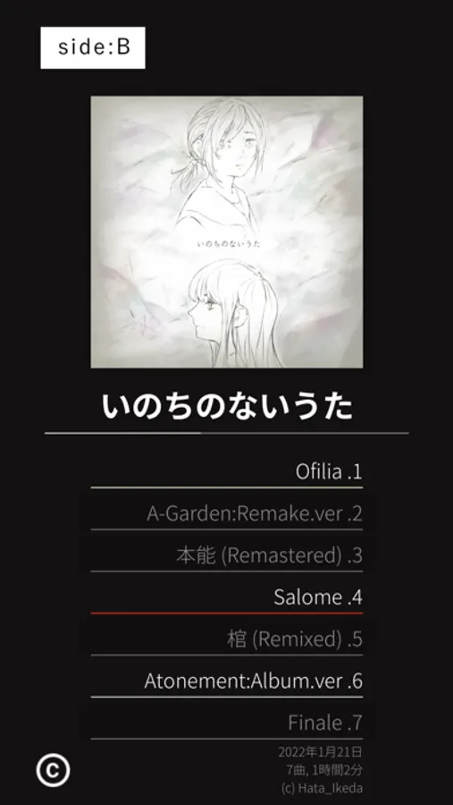 一部を除き収録作品はストーリーに強い繋がりを持たず「死と生」を思わせるダークな世界観を様々な視点から描くような構成になっています。また、アプリのデザインには、歌詞カード風のSSが読めるB面等、ミュージックプレイヤーをモチーフに様々な遊び心を詰め込みました。