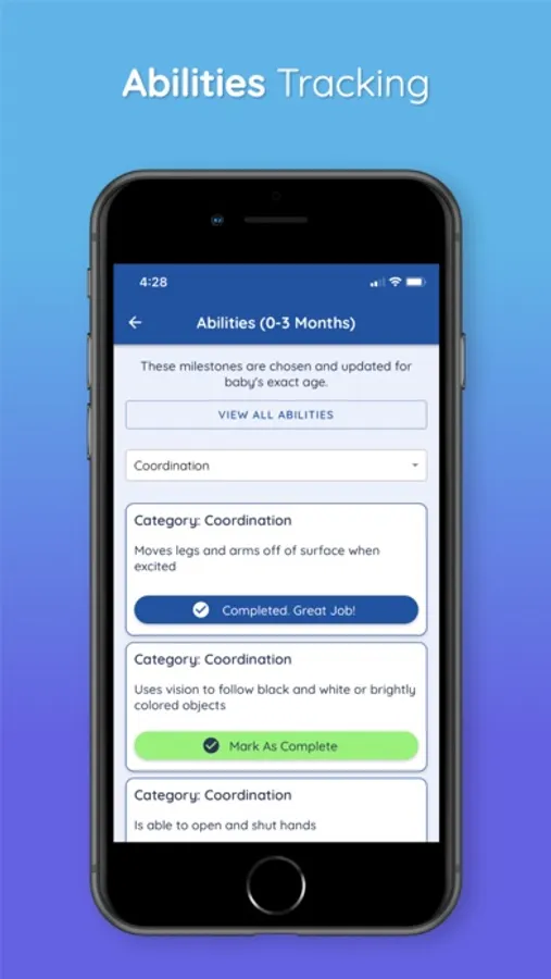 In addition to this, we have baby milestones tracker and baby activities tracker according to the baby's age divided into these age groups: