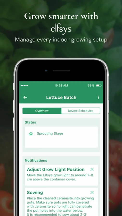 From fresh herbs to gourmet tomatoes, Elfsys Grow Cloud keeps tailored growing templates at your fingertip. Name your plants and tag their attributes. Define growth stages for auto-adaptation of growing configurations.