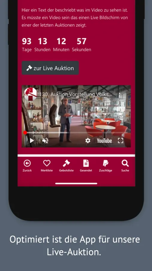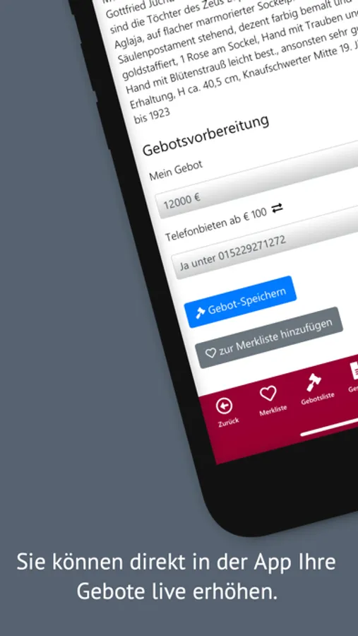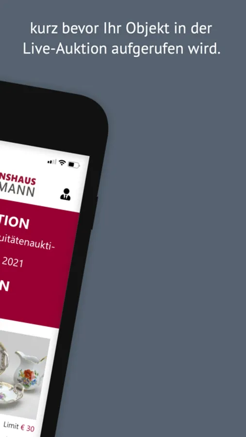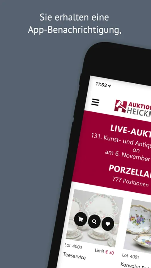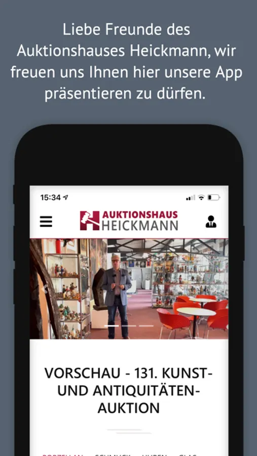Liebe Freunde des Auktionshauses Heickmann, wir freuen uns Ihnen hier unsere App präsentieren zu dürfen. Mit der App haben Sie immer einen Überblick über unsere aktuellen Auktionen sowie Ihre personalisierten Merklisten und Gebote. Optimiert ist die App für unsere Live-Auktion. Sie erhalten eine App-Benachrichtigung, kurz bevor Ihr Objekt in der Live-Auktion aufgerufen wird. Sie können direkt in der App Ihre Gebote live erhöhen, sehen die Auktion mit Bild und Ton, können reagieren, wenn Sie überboten wurden. Nach einmaliger Anmeldung in der App bleiben Sie dauerhaft angemeldet.