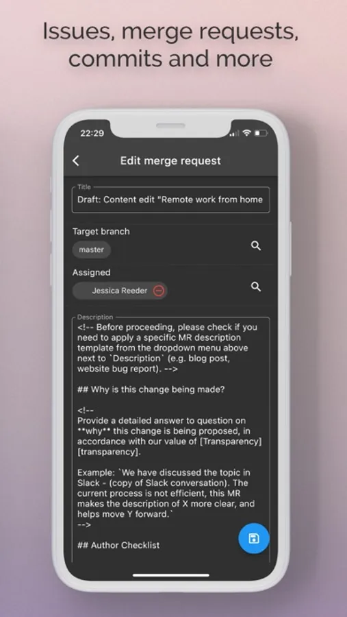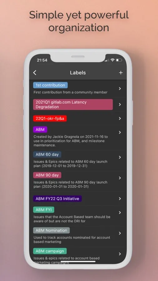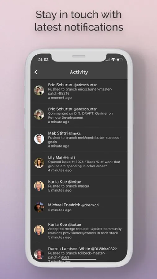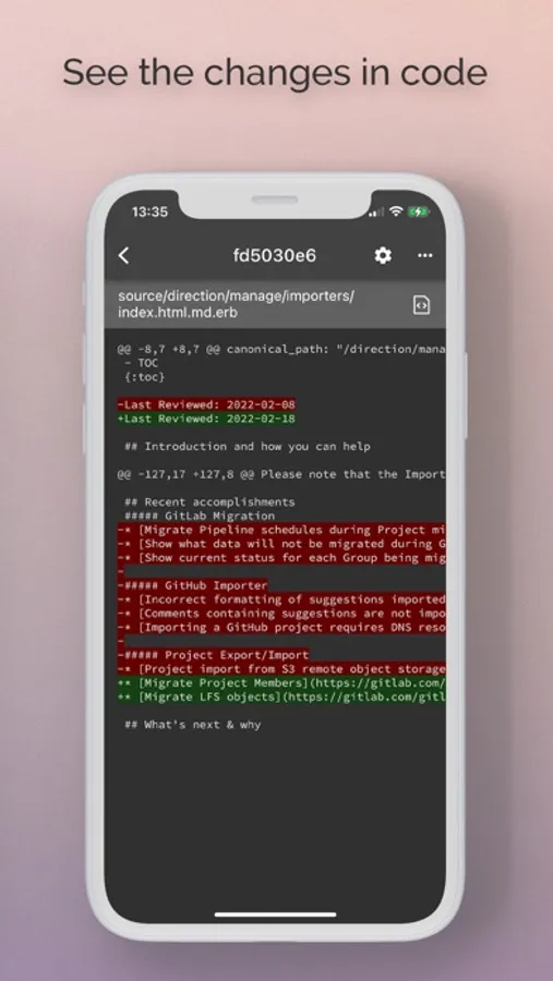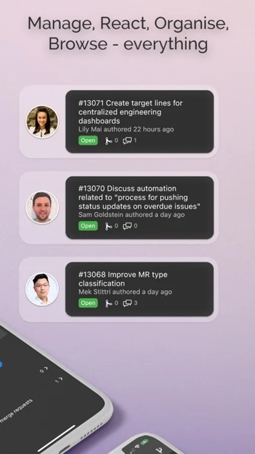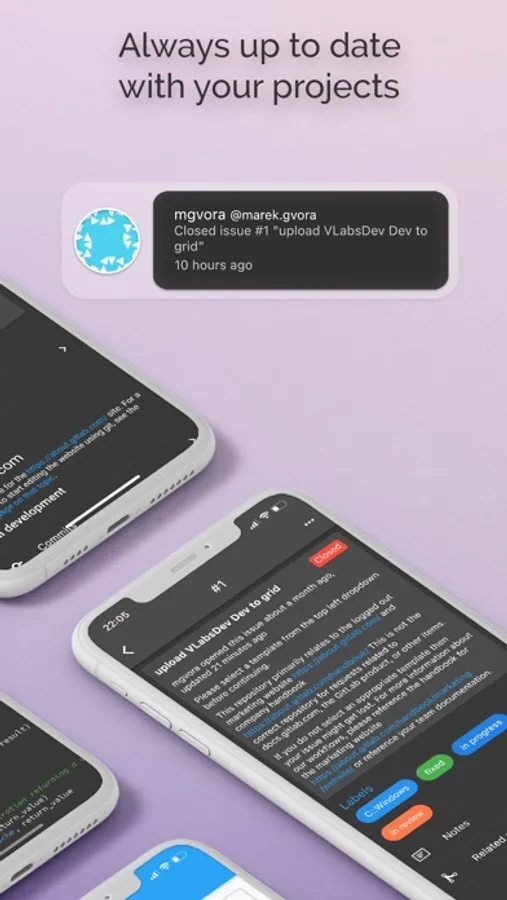 See the latest happenings wherever you are, reply to project issues so they can be taken care of faster, manage and organise projects with labels, browse your files, code and more !
