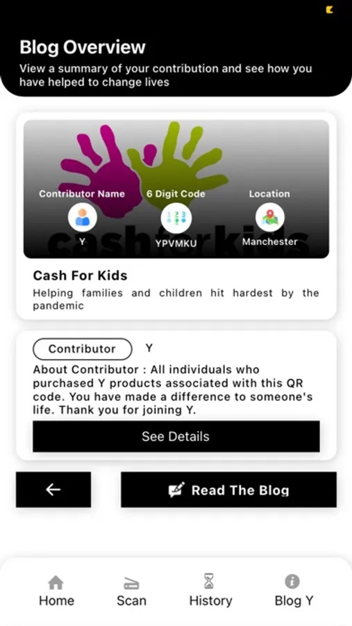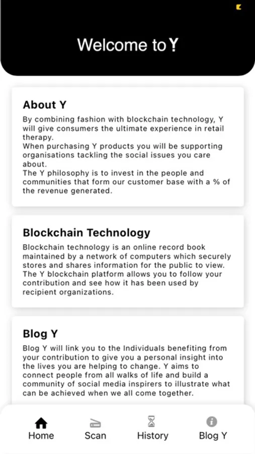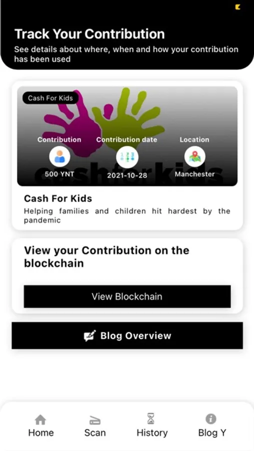 Our blockhain app allows you to scan your purchases made from Shop Y www.wearey.co.uk and see which causes we have supported.