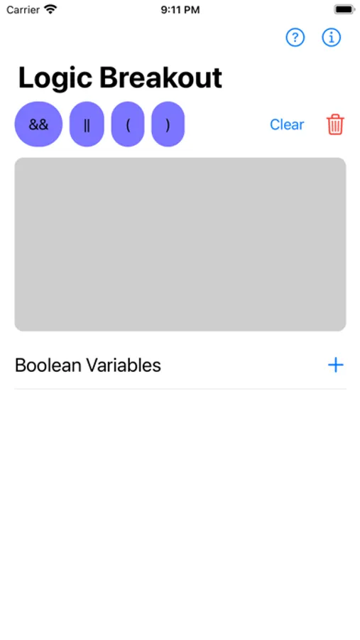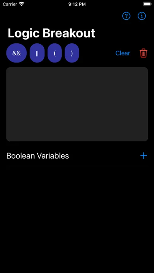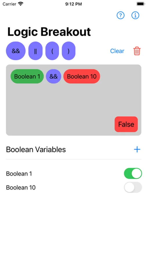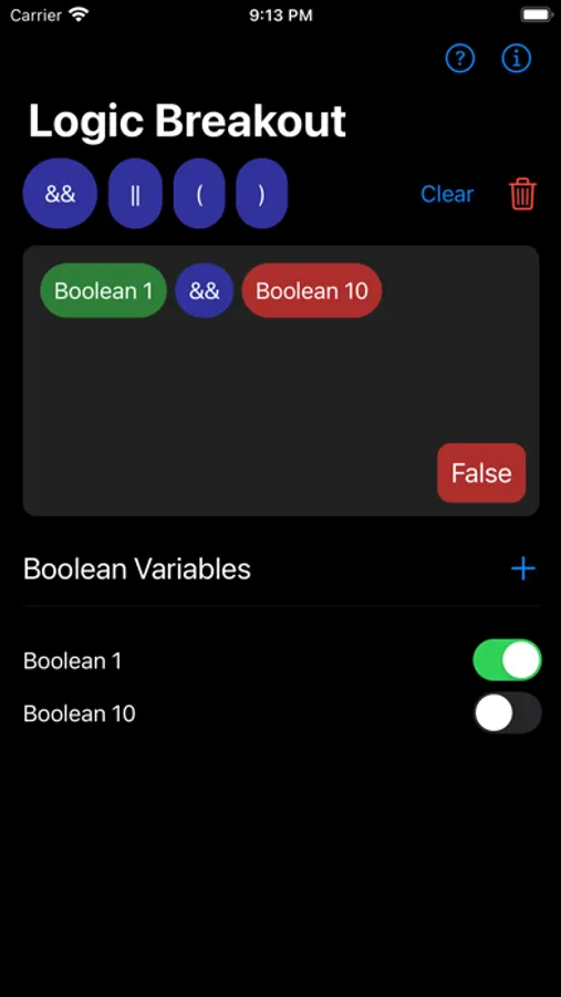 Logic Breakout is a simple logic statement breakdown tool. You can add booleans and operators to your equation and see the result in real time! Add groups with parenthesis, and use the AND and OR operators to complete your equation. Flipping the state of the booleans listed will update the result of the equation, right before your eyes! You can even rename the booleans to help you understand what each one is.