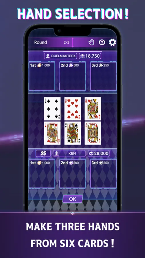 お互いのプレイヤーは6枚のカードが配られ、3つのハンド(1st・2nd・3rd)を作ります。