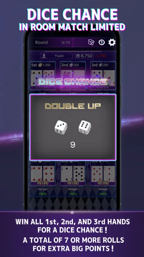 すべてのハンドで勝利すると、2つのサイコロを振ることができます。