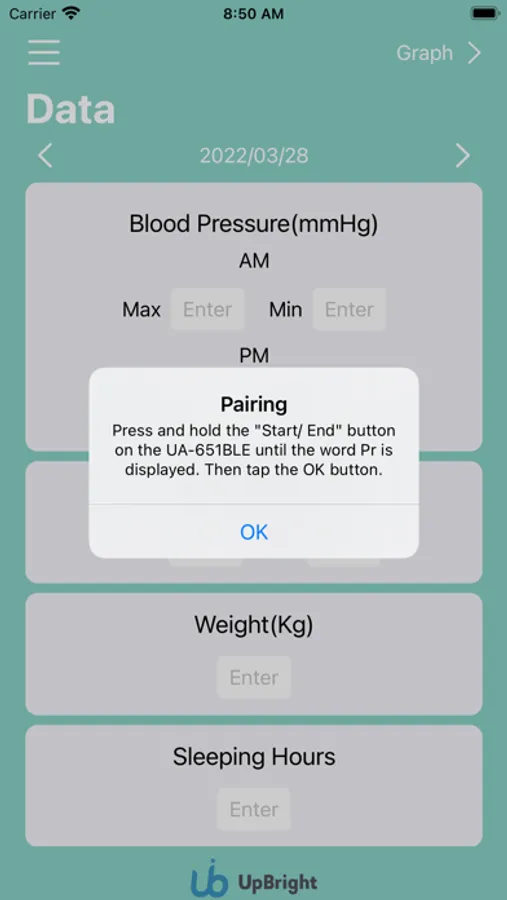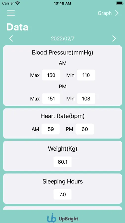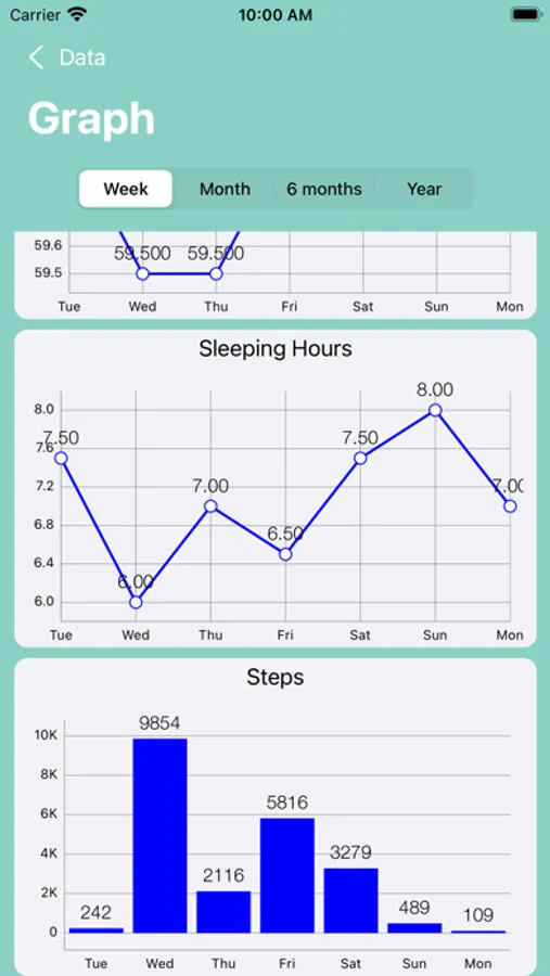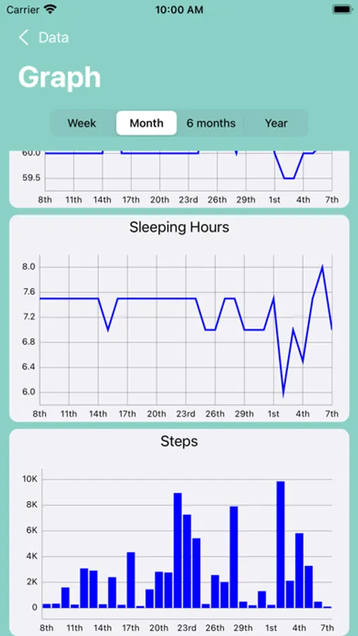 You can see the entered data in a graph on a weekly, monthly, 6-month, or yearly basis.
