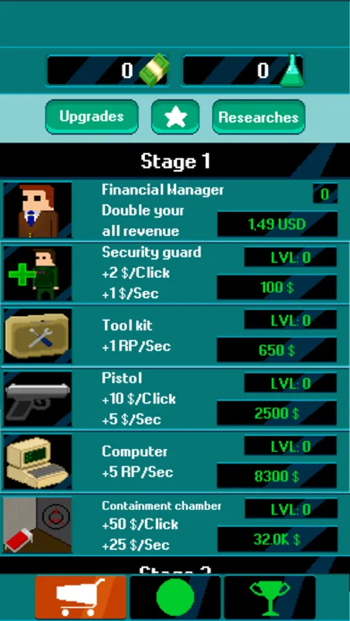 To progress even faster, gain science points and spend them on new research. Each research radically improves the situation with your secret fund and accelerates your progress. More research - faster progress!