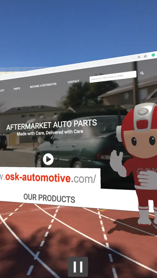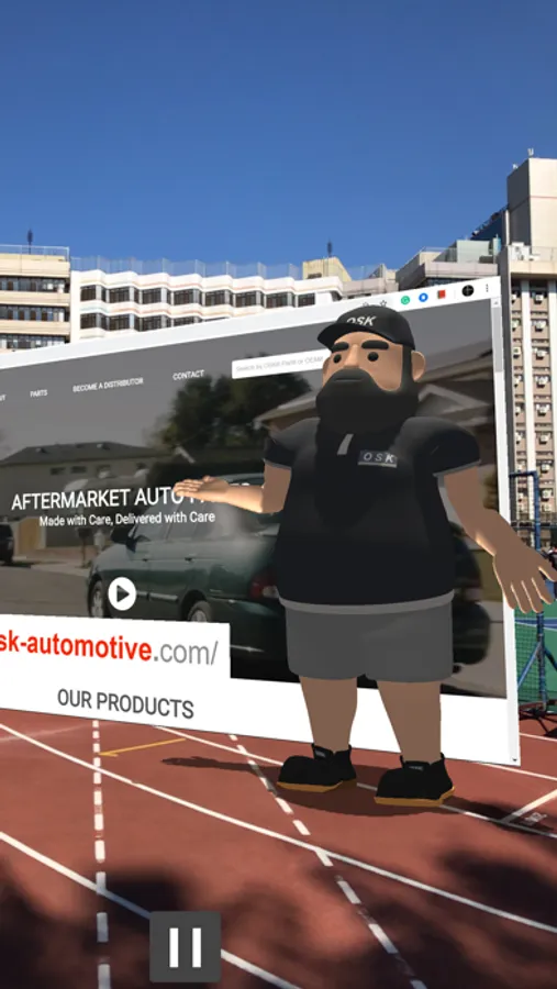 透過這個擴增實境App,可以透過圖卡定位或地面指定呈現虛擬角色,並觀看其介紹 OSK Automotive 公司