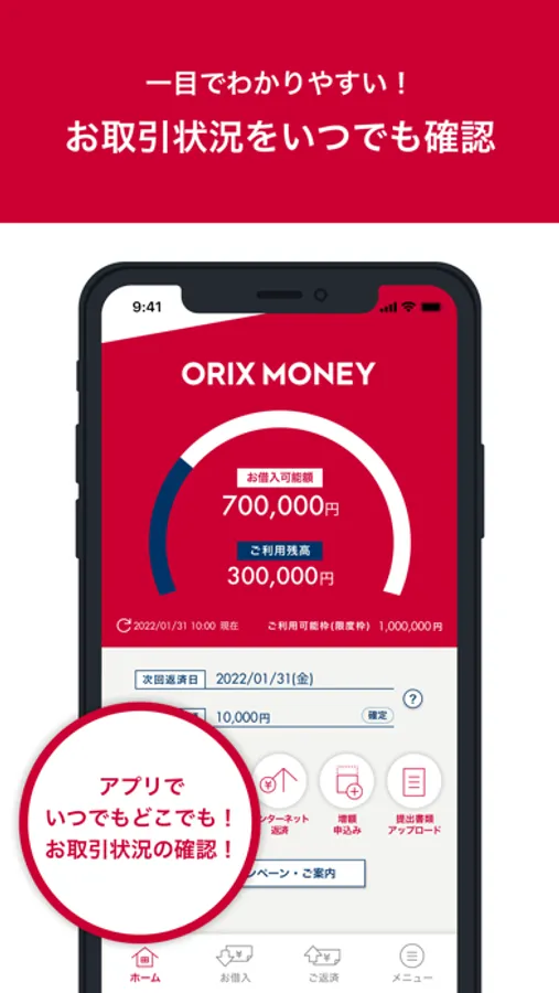 ご利用残高や次回返済日・次回返済金額といったお取引状況を一目でわかりやすく、いつでもご確認いただけます。