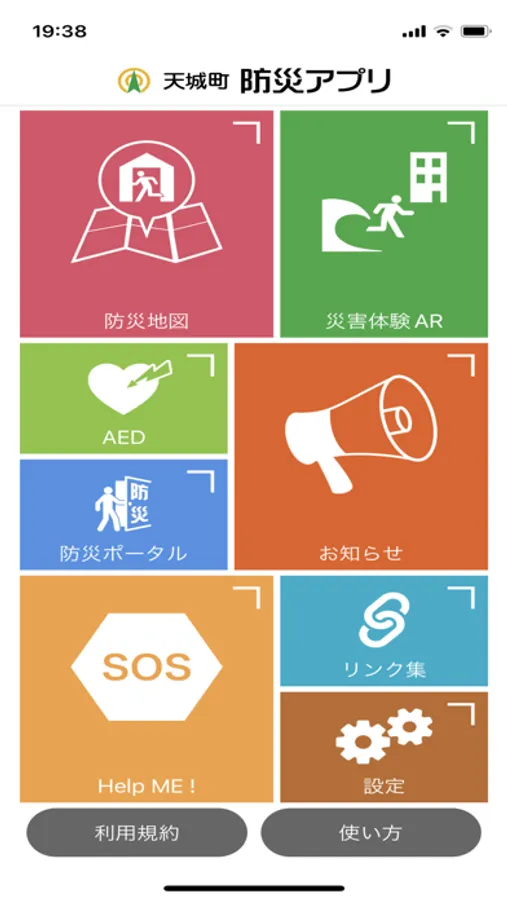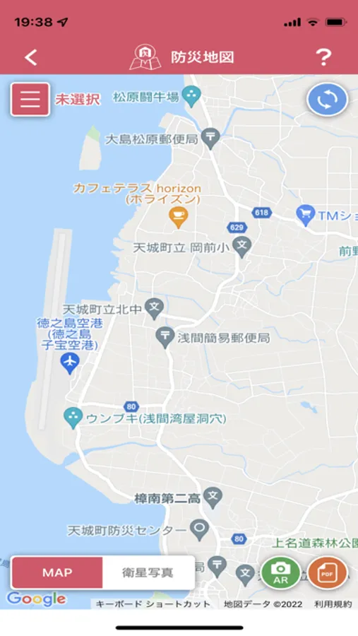 災害種別ごとのハザードマップ、避難所等が確認できます。さらに、AR表示で最寄りの避難所の方向や距離が確認できます。また、事前にハザードマップのPDFをダウンロードしておくことで、インターネットに接続できない状況でも防災地図を表示できます。