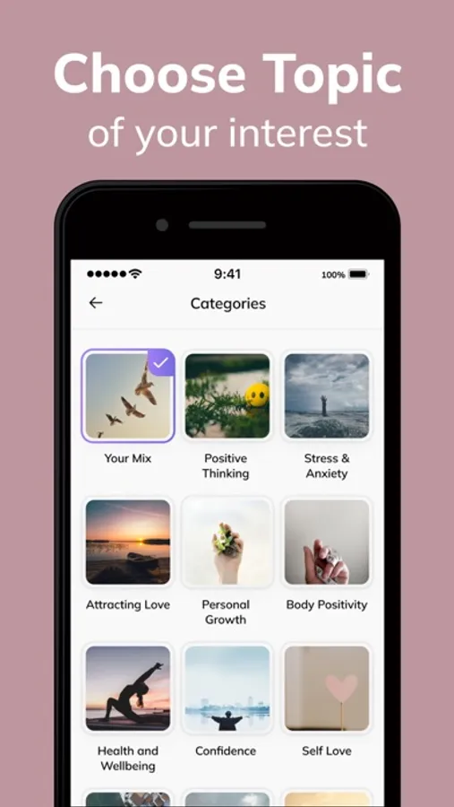 The daily affirmation notifications you receive are shaped according to the categories you choose. The categories you can choose from are: