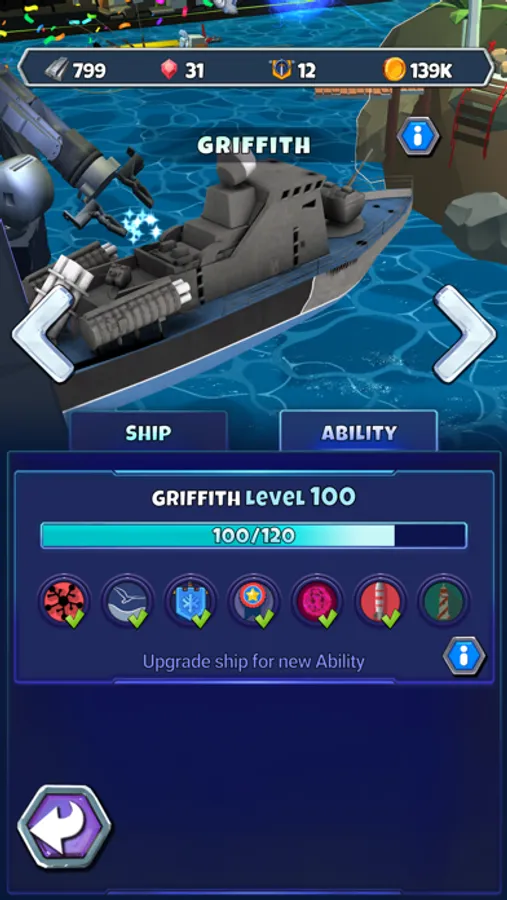 After that, you can improve your warships in 3 main phases: upgrade ship, unlock ship abilities, and learn talents.