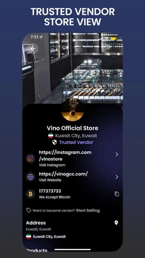 There are two technologies used here, one is Vino chat which is a private and secure chat facility available to all registered users and sellers. The second chat option is managed externally via WhatsApp. In this unique platform, sellers may choose to accept digital currencies as a payment method. Sellers may advertise all details related to their storefront such as physical store location, opening hours, website link and Instagram account link.