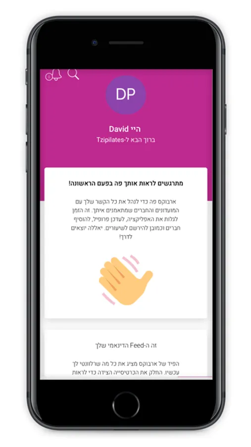 After setting up your personal profile in the app, you'll be able to easily renew your membership, purchase ציפילאטיס merchandise and connect with other ציפילאטיס members.