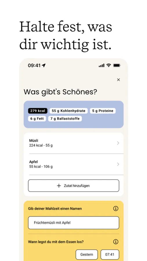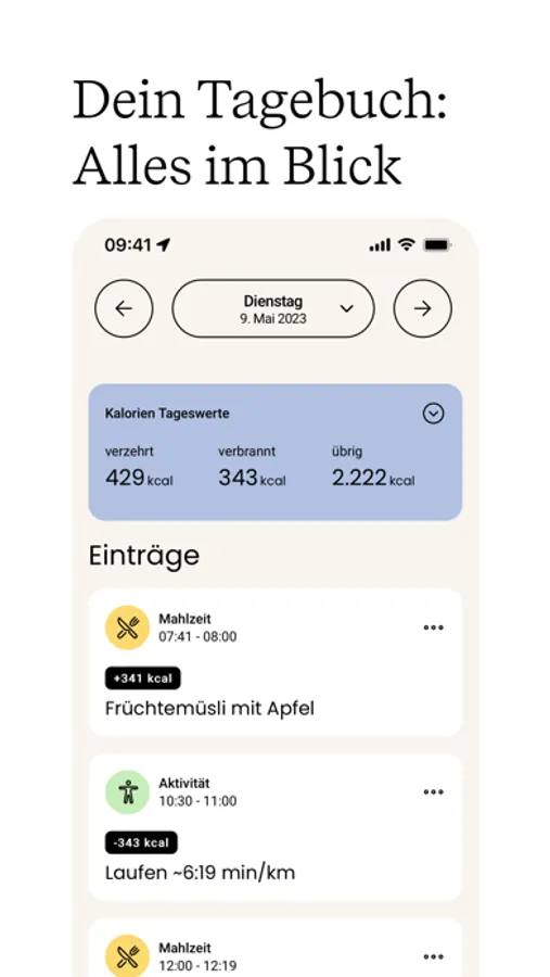 • Tagebuch für einen kompletten Überblick über deine Einträge zu Ernährung, Aktivitäten und mehr