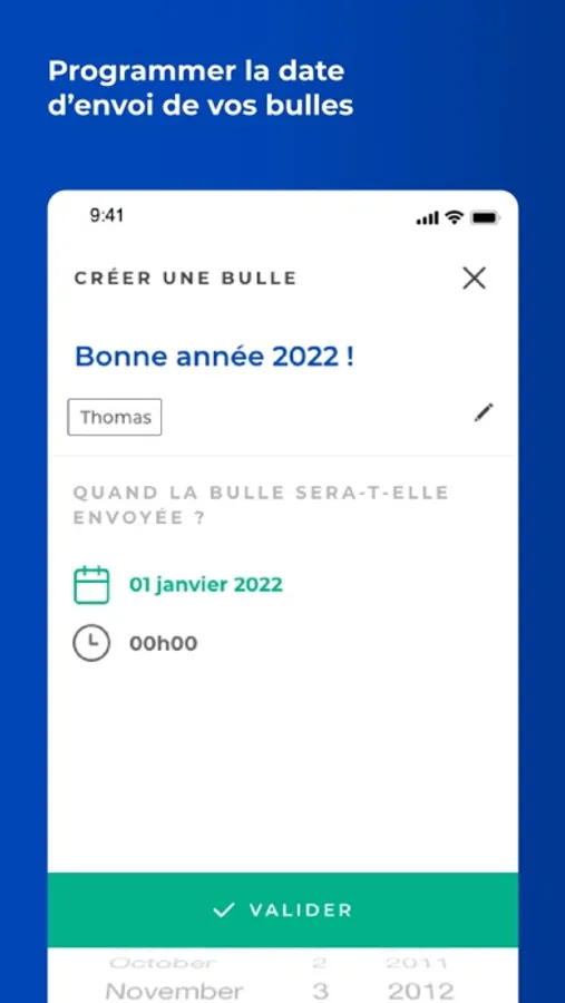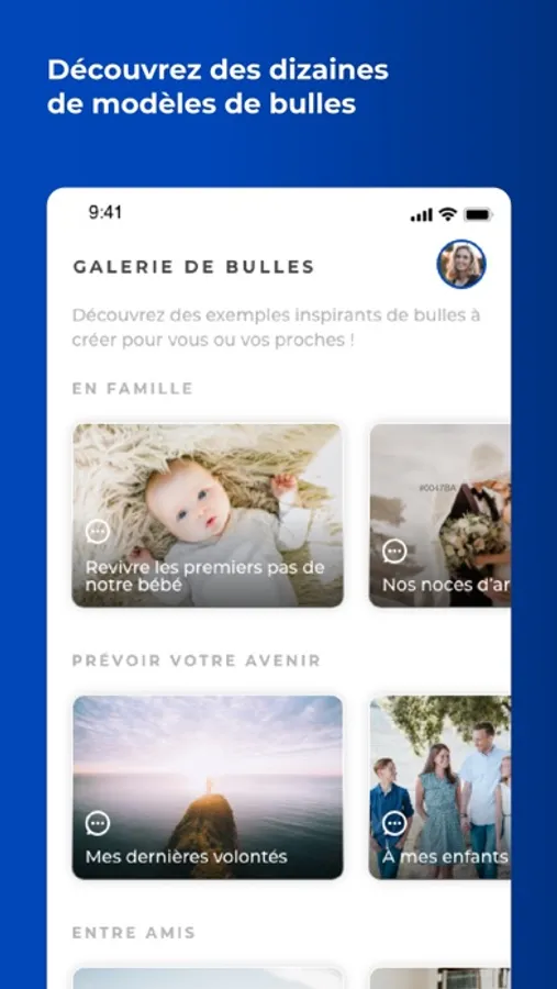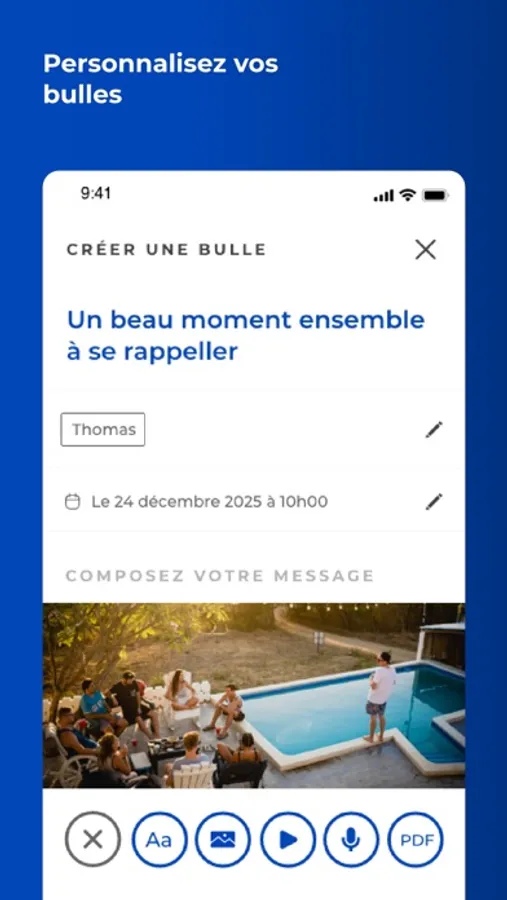 Memoree vous permets d'envoyez des messages dans le futur et de programmez vos souvenirs avec vos amis et vos proches. Vous pouvez créer à partir de nos exemples des bulles spatio temporelles avec des textes, des images, des mini-vidéos des messages vocaux et des documents PDF.