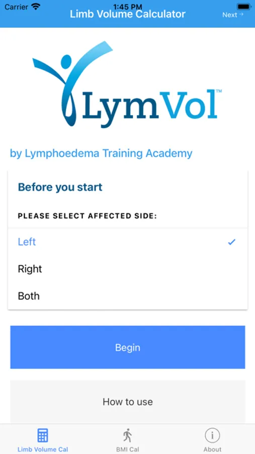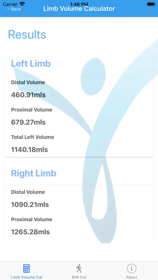 The method of calculation used in this application is a recognised mathematical and medical standard for measuring limb volume. It is calculated through the measure and addition of cyclindrical 4cm sections of both the Distal and Proximal for each limb.