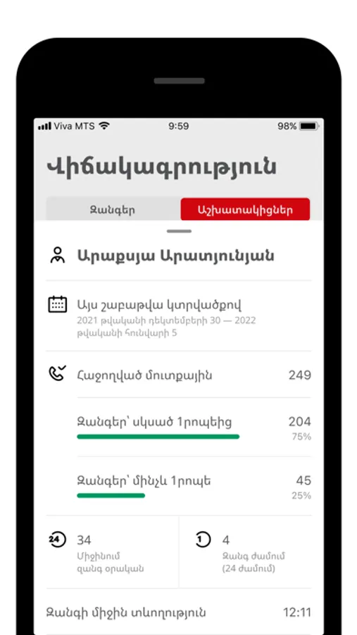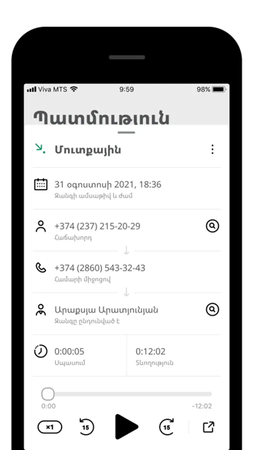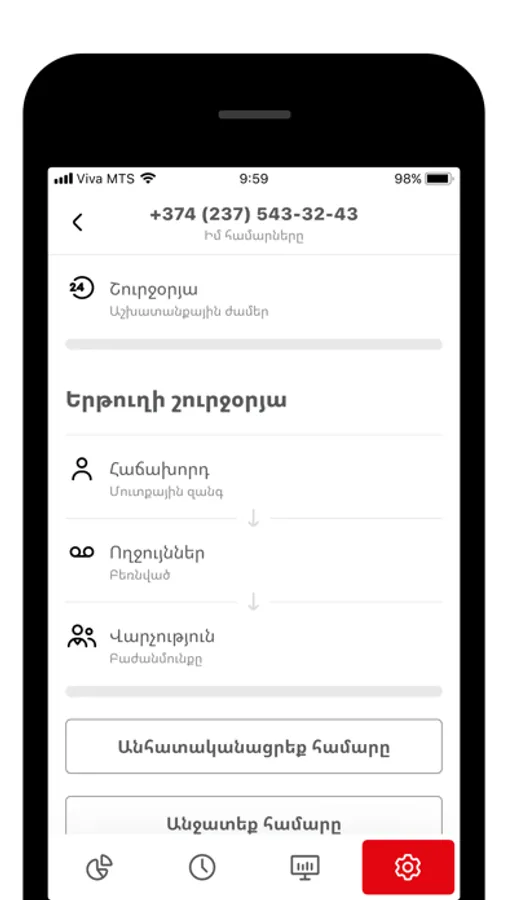 Install the PBX Viva-MTS mobile application, enter the login and password for your personal VATS account and control the company's calls in real time.