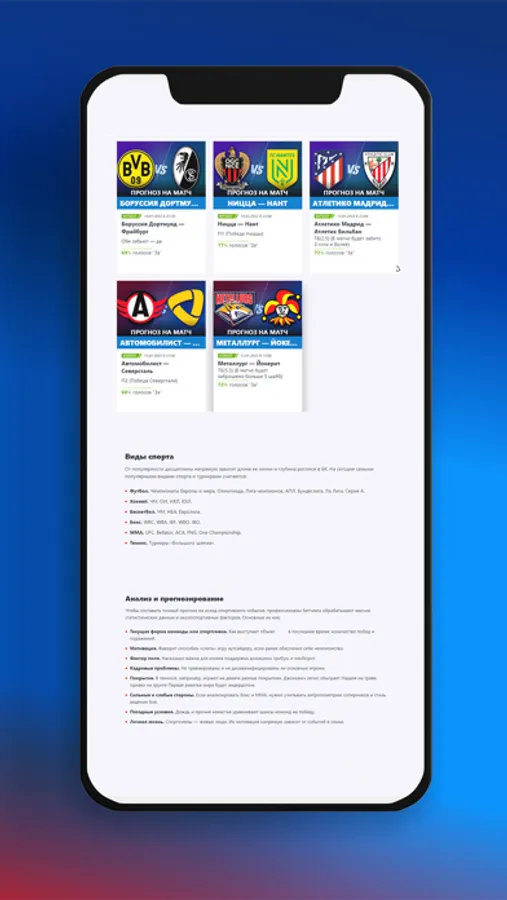 Пользователи получают доступ к ежедневным вариантам ставок на спортивные события текущего дня или недели. Каждый прогноз ― это анонс, детальная аналитика, последние новости, статистика и история личных встреч. Игроки участвуют в голосовании на проходимость ставки, что становится дополнительным аргументом для беттора.