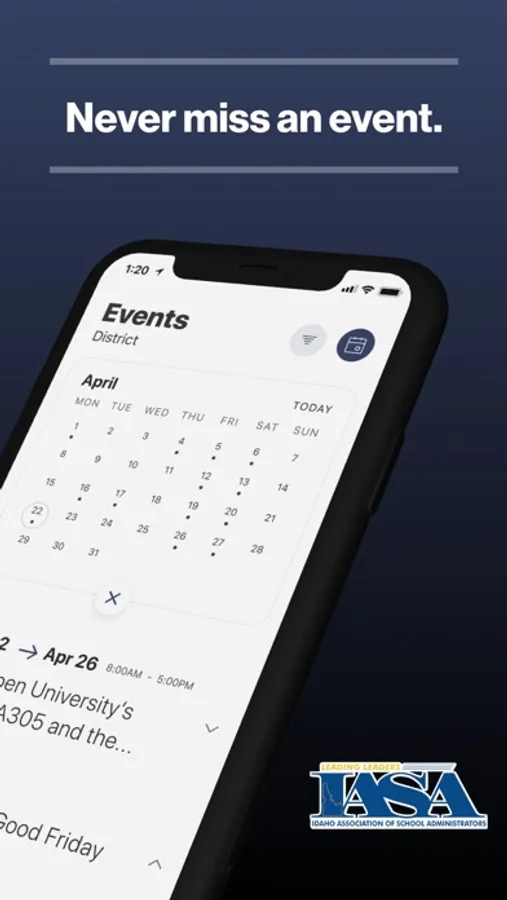 The event section shows a list of events throughout the district. Users can add an event to your calendar to share the event with friends and family with one tap.