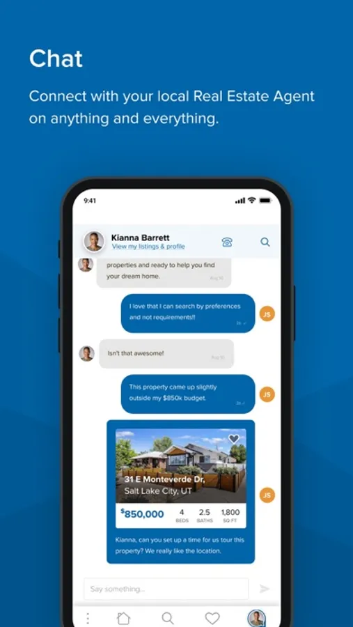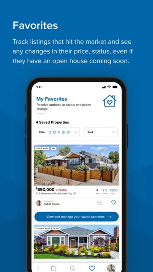 My Favorites: View saved searches and suggested homes with ease and connect with your agent for any questions.