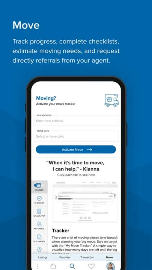 My Move: View move progress, estimate moving needs, complete checklists, and receive service referrals or second opinions from your agent.