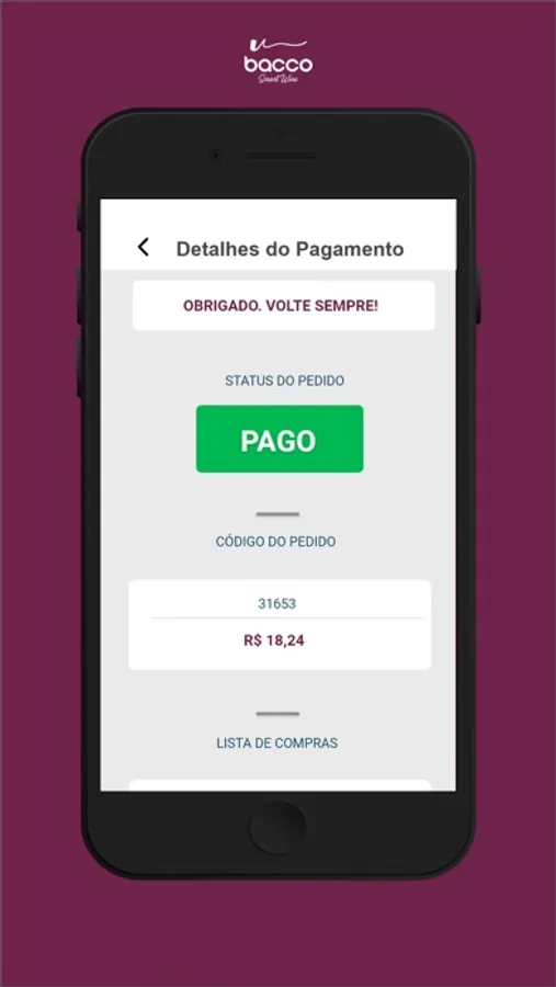 Com o aplicativo Bacco Smart Wine você poderá comprar o seu rótulo de vinho preferido para momentos especiais. Além de outros produtos exclusivos como: whiskys, lícores, espumantes, charutos e delicatesses.