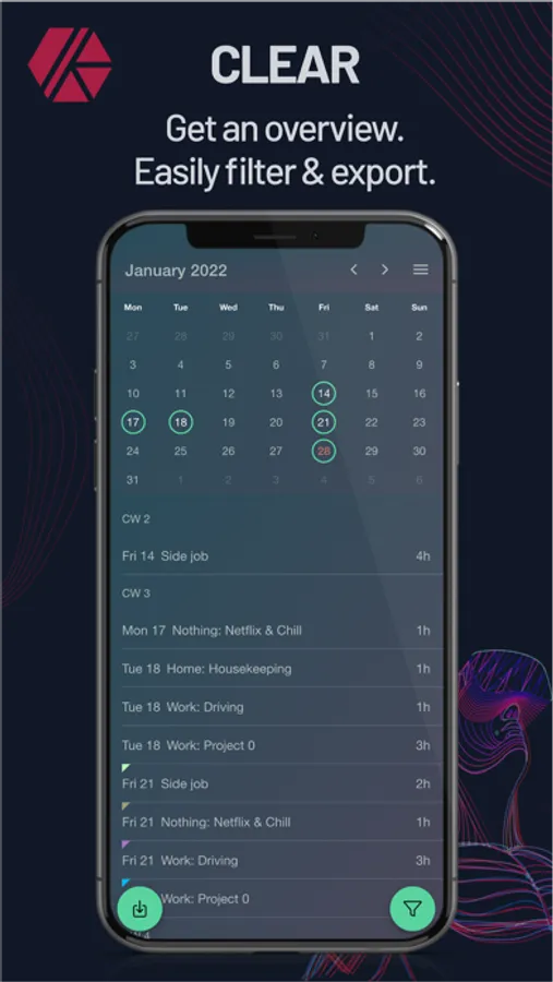 The Calendar view clearly shows you which days are already tracked. You can filter tasks by category and export your tracked times as XLSX, CSV or JSON file.