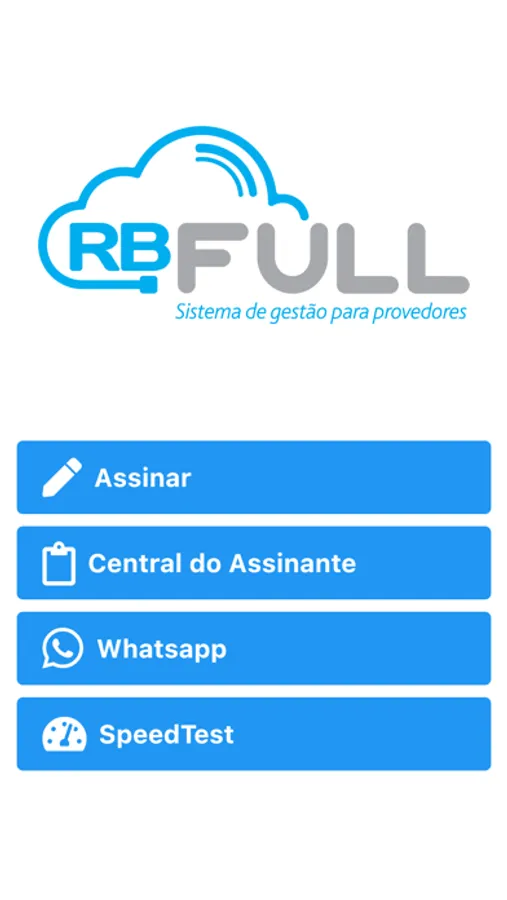 Central do assinante RBFULL, para segunda via de cobranças, relatório de velocidade, chamada, identificação de cadastro.