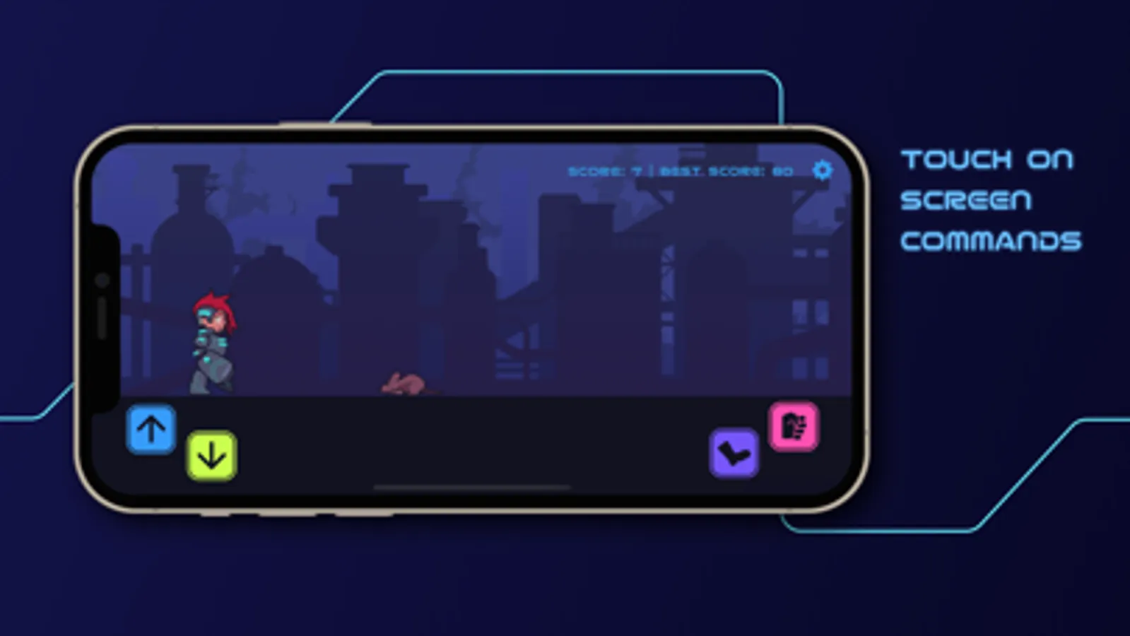 Enter the cyberpunk atmosphere and be the fastest overcoming city obstacles. A game for you to challenge your skills. Use the on-screen buttons for character movement and action. Have fun!