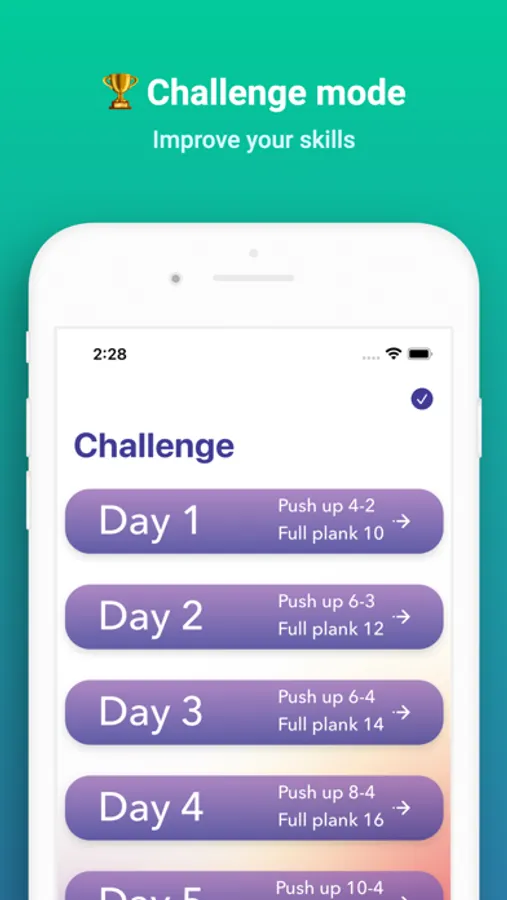 This app will count push ups instead of you. Create your own sets or use challenge our challenge mode and improve your skills