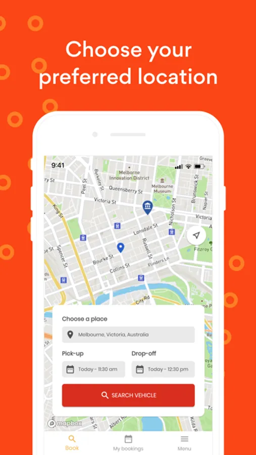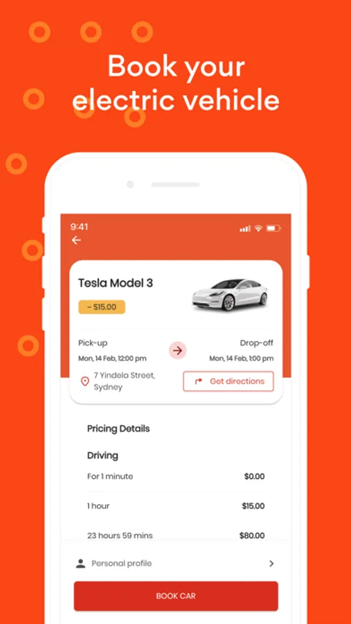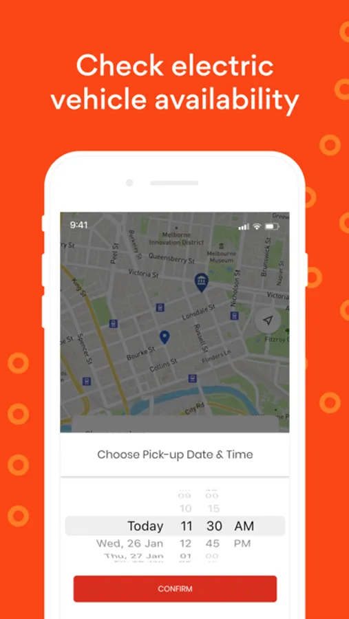 - Enter pick-up and drop-off times, select an available electric vehicle and book