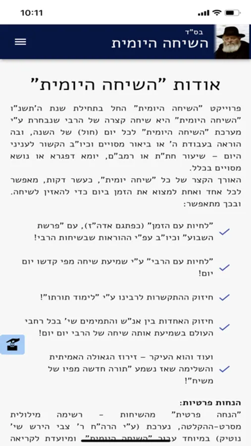 The short length of each "Daily Sicha", about ten minutes, allows everyone to find the time of day to listen to the conversation. This allows: