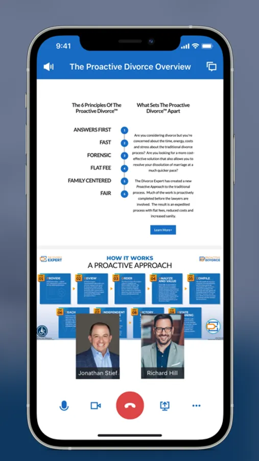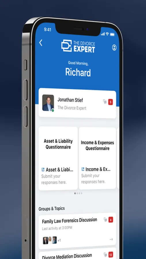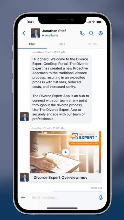 The Divorce Expert App is a hub to connect with our team at any point throughout the divorce process. Use The Divorce Expert App to securely engage with our team of professionals. Securely exchange documents, e-sign contracts, task-manage & schedule face-to-face video meetings, receive real-time updates throughout the divorce process, and more.