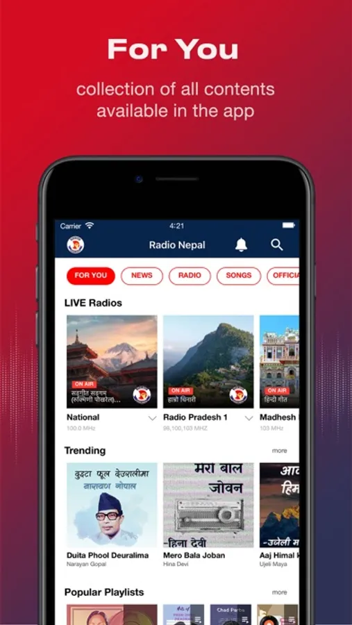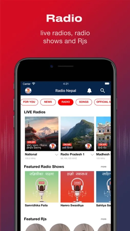 "Radio Nepal (रेडियो नेपाल) owned by the Nepal Government was established on 2 April 1951. The transmission initially ran for 4 hours and 30 minutes using a 250-watt SW transmitter. Over the years, Radio Nepal has significantly strengthened its institutional capacity and has diversified in terms of program format, technical efficiency, and coverage. Radio Nepal broadcasts programs on mid-wave and FM frequencies. The regular programming runs for 24 hours per day, with approximately 4 hours of programming beginning at 14:15 hrs. To 18:00 hrs. FM Kathmandu, the first FM Channel in Nepal covering the Kathmandu Valley and adjacent areas, commenced in 1995 from its premises in Singh Durbar, Kathmandu.