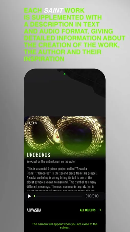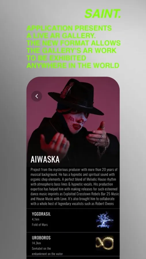 SAINT. The SAINT community is for creative people from all over the world to create a world wide art exhibitions. Musicians, artists, sculptors, designers - representatives of any creative direction find new opportunities for development in our community. The community organizes exhibitions, events, presentations in real life and in virtual space. SAINT brings together the best to create the art of the future. The SAINT application presents a living AR gallery. The new format allows the gallery's AR work to be exhibited anywhere in the world. With the help of the application map, anyone can find the exhibited object closest to him and come to look at it. Each work is supplemented with a description in text and audio format, giving detailed information about the history of the creation of the work, about the author and his inspiration. Discover and share a new world with the SAINT app. Our works are also presented in Metaverse and have artworks based on this 3D models. Real art has no boundaries.