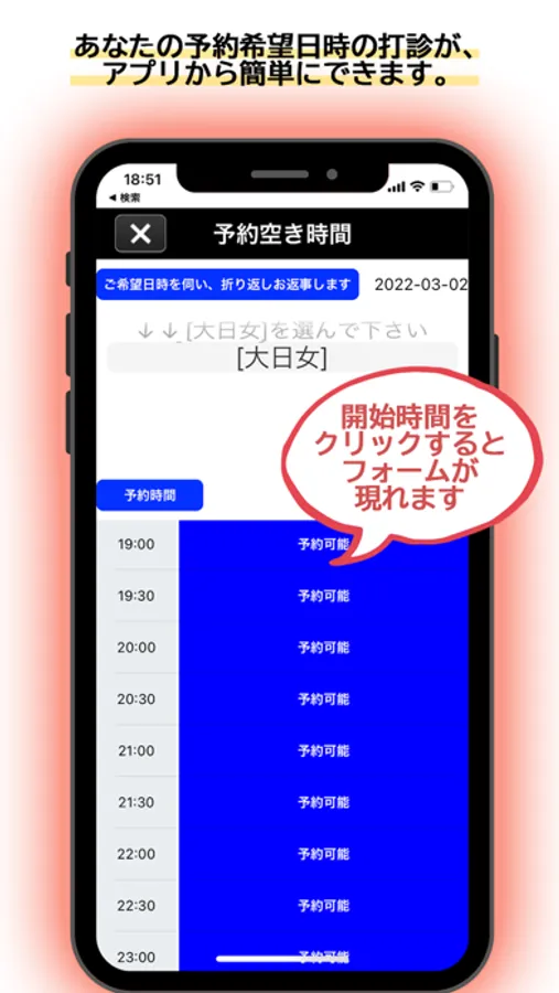 アプリの予約ページで、予約希望日を押し、[予約登録及び予約時間照会]ボタンを押してください。