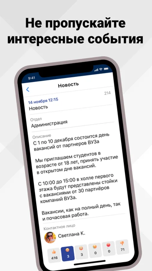 Раздел и уведомления о новостях и событиях отделения, с возможностью записаться на мероприятие или оставить на него реакцию.