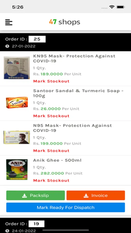 Packer Application can be downloaded by Packing Boys of 47shops' clients. Packer App is the part of order processing and interface is self explanatory. Herein, Packing Boys would get order details like product name ordered along with their images and quantity ordered and Packing Boys will pick the items from the store and pack accordingly.
