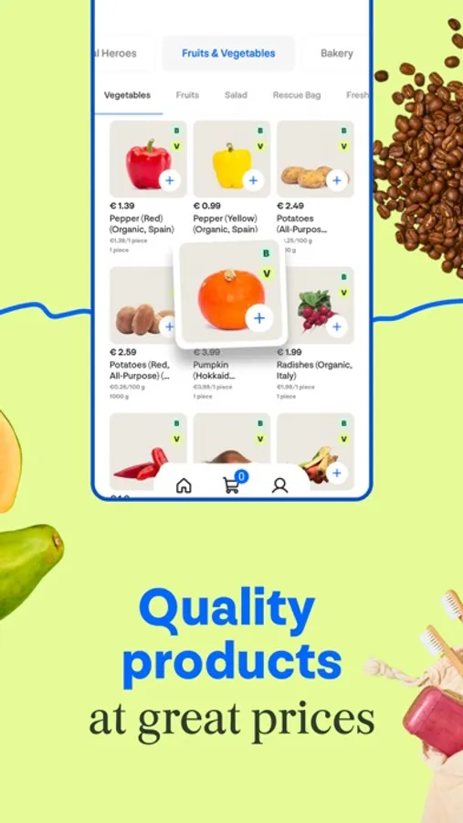 ► Huge selection: We have over 1,300 sustainable products. You’ll find everything you need for your weekly shopping: dairy products, fruits, vegetables, nuts, pasta, household products and much more.