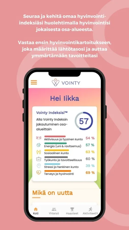 Vointy on uusi kokonaisvaltainen hyvinvointisovellus, joka tukee kehon ja mielen hyvinvointia yhteisöllisesti.