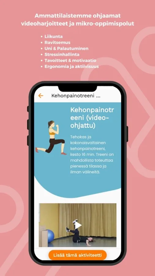 Voit kehittää ja seurata omaa hyvinvointimittariasi ja kokeilla uusia aktiviteettejä, tai esimerkiksi jumpata kotona ammattilaistemme luomien videoiden ohjeistuksella.