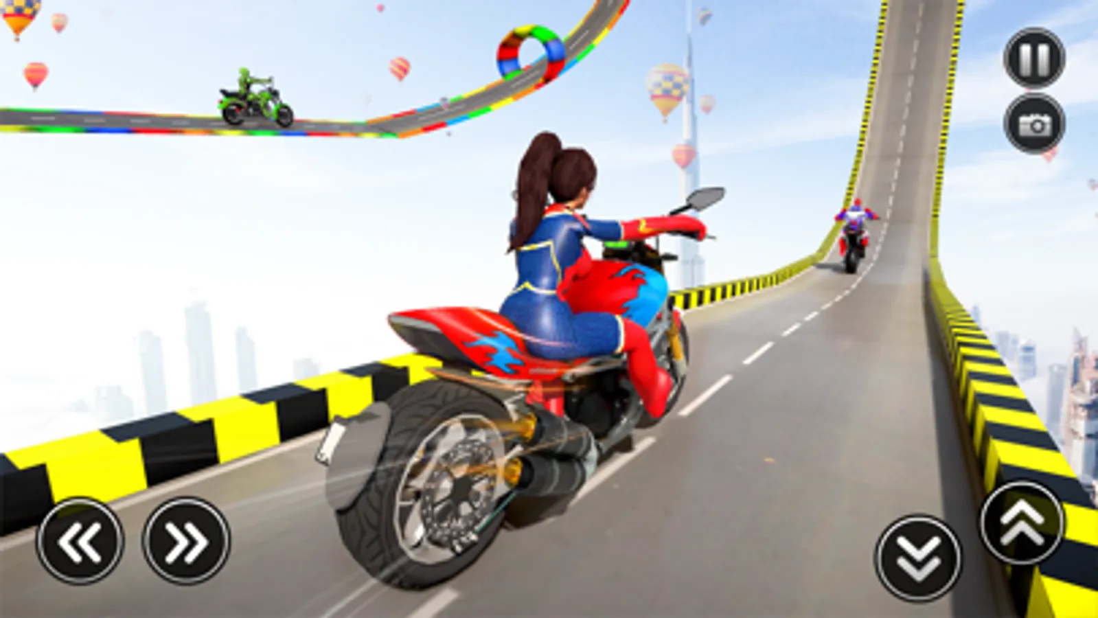 Enjoy the infinite mode with your favorite superhero character and perform stunts as long as you can. Collect the coins on your almost impossible tracks to increase the in-game coins. Use good use of the fire button and rocket button to explode the hurdles on your way. But keep in mind you have limited bullets and rockets. You can also collect extra bullets and rockets while riding your superbike on mega ramp tracks.