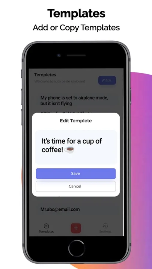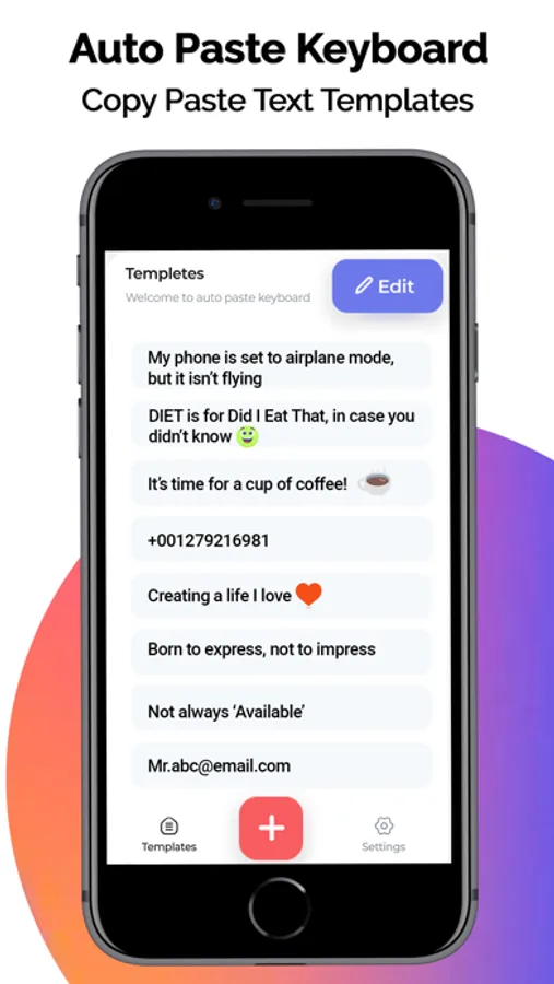 Auto paste keyboard to quickly copy paste text and fill templates. Copy paste keyboard enables you to send text on one click without typing again and again. Add text templates or edit the default templates and easily send any text in chats and messages using paste keyboard. Get rid of typing the same text again and again and create your own templates for address, email, contacts, signatures and more.