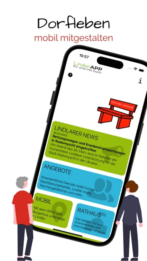 Die LindlarApp bietet allen Lindlarer Bürger*innen einfachen Zugang zu Terminen und Neuigkeiten aus dem Gemeindegebiet, stellt die ehrenamtlichen Dienste des Quartiersmanagements vor, beinhaltet eine Karte mit Informationen zum lokalen ÖPNV-Angebot und gibt Zugang zu den Online- Bürgerservices des Lindlarer Rathauses.