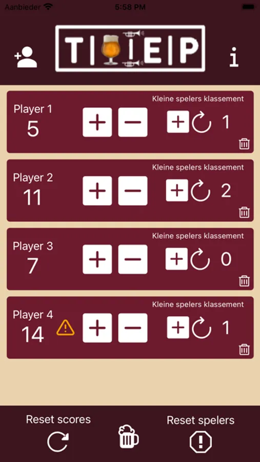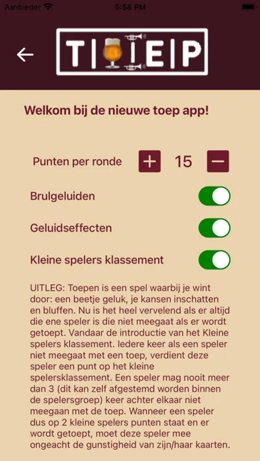De Toep App biedt de mogelijkheid om makkelijk de score bij te houden bij een potje toepen. Eventueel met kleine spelers klassement!