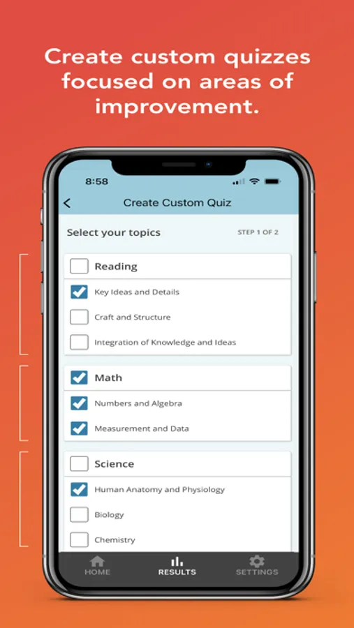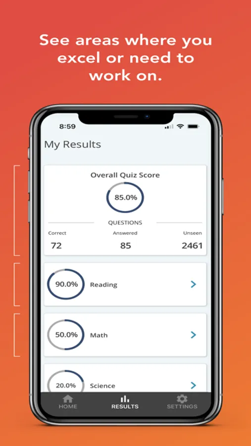 • 2 different quizzes by topic area including: reading, math, science, and English and language usage