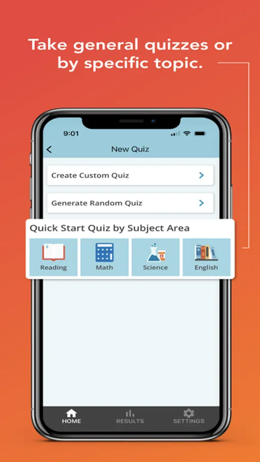 • Quick start quizzes by subject area (reading, math, science or English and language usage)