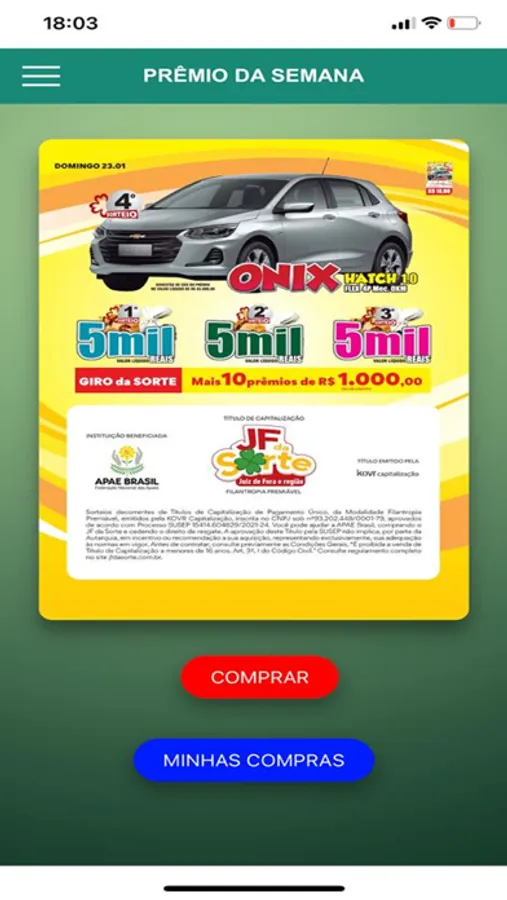 Aplicativo de compras do JF DA SORTE– Título de Capitalização de Pagamento Único, da Modalidade Filantropia Premiável, emitido pela KOVR Capitalização S.A. – KOVRCAP (CNPJ n.º 93.202.448/0001-79